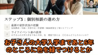 「うちの子大学まであと〇年しかない野澤さんどうしよう?」この言葉を引き出すために逆算したトークでFP顧問が決まります。 【動画】